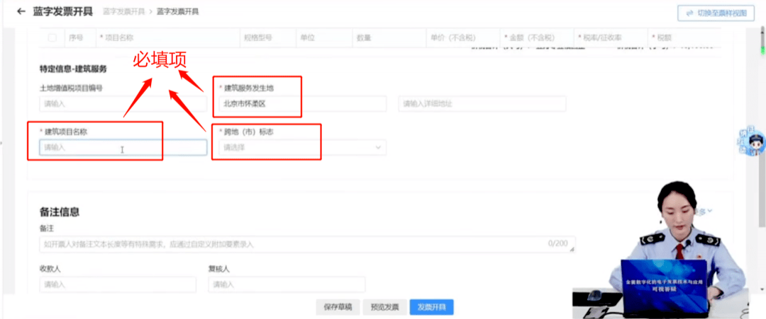 1、銷售方在開具建筑服務(wù)發(fā)票時,數(shù)電票票面設(shè)定特定欄次,備注欄在其中,開具過程中這些特定欄次必須填寫,否則發(fā)票就開不出來;只是開出來不在“備注欄”顯示,在票面其他地方顯示。