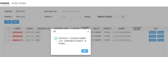 發(fā)票開(kāi)具:可在電子稅務(wù)局“發(fā)票使用-個(gè)人出租房屋代開(kāi)紅字發(fā)票(增值稅電子普通發(fā)票)”查看申請(qǐng)記錄,顯示狀態(tài)“紅沖審核通過(guò)”。點(diǎn)擊“開(kāi)具發(fā)票”即可。