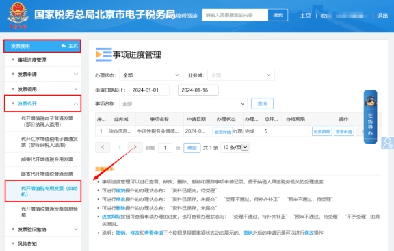 您好,請點(diǎn)擊【我要辦稅】—【發(fā)票使用】—【發(fā)票代開】—【代開增值稅專用發(fā)票(自助機(jī))】,在申請記錄列表里,點(diǎn)擊后端【清單打印】選項(xiàng)。