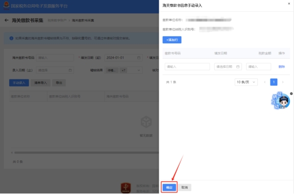 四、點(diǎn)擊【手動錄入】錄入海關(guān)繳款書信息,點(diǎn)擊“確定”成功后,稍后可在查詢界面根據(jù)需要輸入或選擇相關(guān)查詢條件,然后點(diǎn)擊“查詢”按鈕,在結(jié)果展示區(qū)顯示符合查詢條件的海關(guān)繳款書。