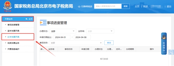四、錄入查詢條件查詢到此前開(kāi)具的紅字信息確認(rèn)單,點(diǎn)擊右側(cè)的“去開(kāi)票”,進(jìn)入紅字發(fā)票開(kāi)具頁(yè)面,之后正常開(kāi)具紅字發(fā)票即可。