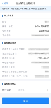 轉讓方申報的最后一個步驟,系統(tǒng)會自動根據(jù)前三步的填報數(shù)據(jù),展示本次轉讓的計稅明細及需要繳納的個人所得稅。確認無誤后點擊“提交資料”,股權轉讓信息就會提交至受讓方進行核對。