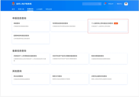 在自然人電子稅務局(WEB端)“我要查詢”——“個人股權轉讓資料報送記錄查詢”模塊可以查看主管稅務機關對股權轉讓材料的審核進度。