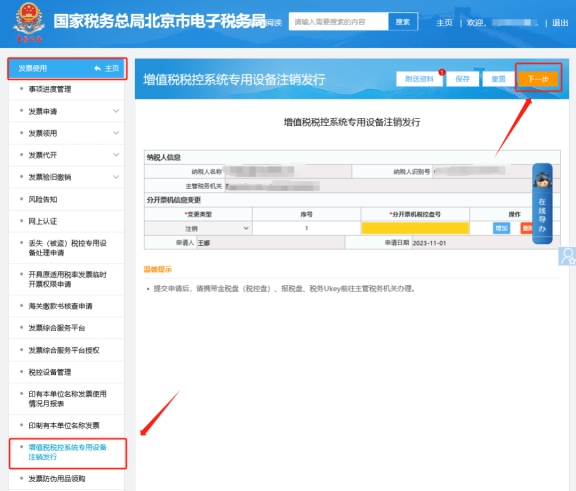 二、發(fā)票使用—增值稅稅控系統(tǒng)專用設(shè)備注銷發(fā)行,進入即可展現(xiàn)填寫界面,請根據(jù)頁面信息填寫完畢并上傳附送資料信息,點擊下一步提交。