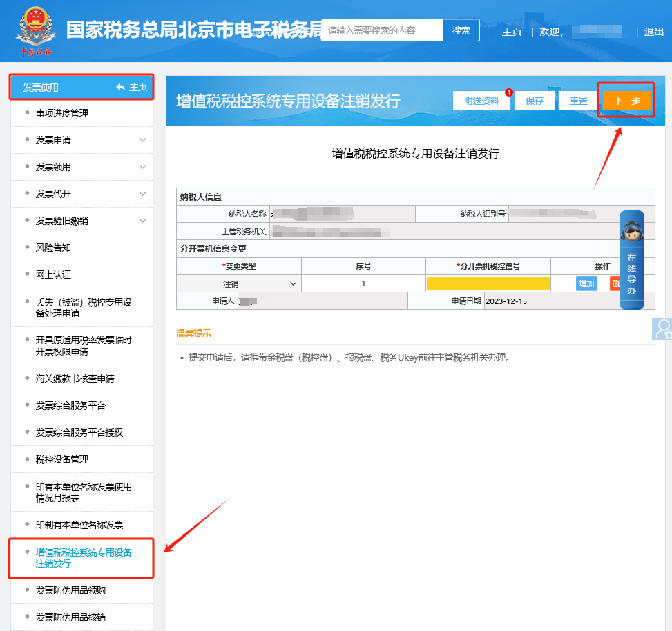 二、發(fā)票使用—增值稅稅控系統(tǒng)專用設(shè)備注銷發(fā)行,進(jìn)入即可展現(xiàn)填寫(xiě)界面,請(qǐng)根據(jù)頁(yè)面信息填寫(xiě)完畢并上傳附送資料信息,點(diǎn)擊下一步提交。