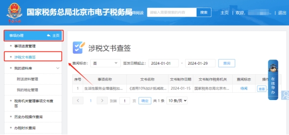 二、事項辦理—涉稅文書查簽中簽收文書。