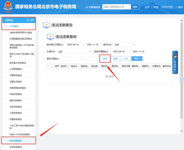 2.您可點(diǎn)擊【我要查詢】—【一戶式查詢】—【違法違章查詢】查看是否有違法違章信息,在此界面根據(jù)需要調(diào)整查詢條件(案件登記日期起止、案件狀態(tài)、處理狀態(tài)、稅款所屬期起止、查詢?nèi)掌谄鹬?點(diǎn)擊查詢按鈕即可查詢展現(xiàn)違法違章信息。