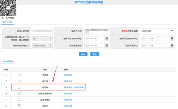 三、進(jìn)入“財(cái)產(chǎn)和行為稅納稅申報(bào)稅源采集”模塊后,點(diǎn)擊“印花稅”后方【稅源采集】。