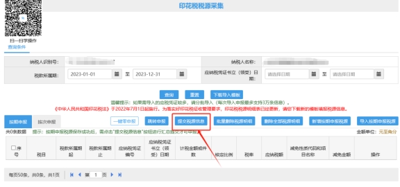 新增稅源信息保存成功后系統(tǒng)自動(dòng)返回按期申報(bào)界面,根據(jù)查詢條件,選擇稅款所屬期2023年1月1日至2023年12月31日后點(diǎn)擊【查詢】,查到信息后勾選當(dāng)前需要申報(bào)的稅源信息后點(diǎn)擊右上【提交稅源信息】,提示提交稅源信息成功后點(diǎn)擊【確定】。