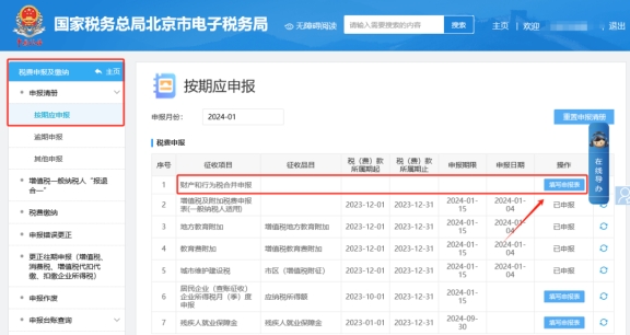 二、稅費(fèi)申報(bào)及繳納—申報(bào)清冊(cè)—按期應(yīng)申報(bào)—財(cái)產(chǎn)和行為稅合并申報(bào)。
