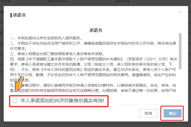 第二步:查看承諾書,勾選【本人承諾添加的共濟(jì)對(duì)象身份真實(shí)有效!】,點(diǎn)擊【確定】按鈕。