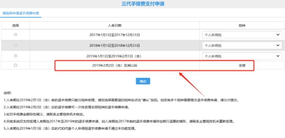 三、三代手續(xù)費(fèi)支付申請(qǐng)頁(yè)面,進(jìn)入后選擇2019年2月2日(含)及其以后點(diǎn)擊確定按鈕,進(jìn)入下一步,選擇開戶銀行、銀行賬號(hào)、填寫經(jīng)辦人及聯(lián)系電話,檢查帶出的信息(稅款類型、稅種、稅款所屬期、入庫(kù)金額、支付比例、手續(xù)費(fèi)金額)是否正確,確認(rèn)無(wú)誤后點(diǎn)擊提交申請(qǐng)按鈕即可。