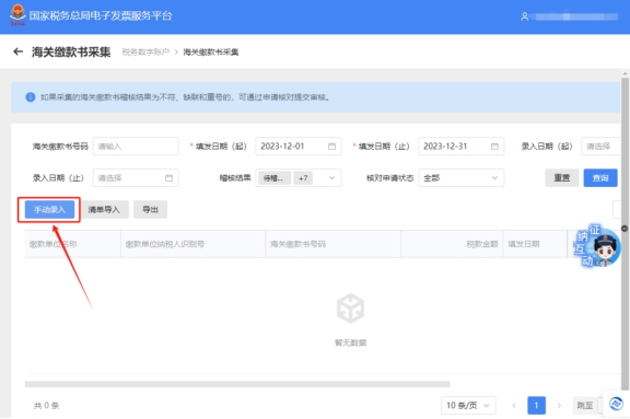 三、海關(guān)繳款書采集頁面,點(diǎn)擊【手動錄入】錄入海關(guān)繳款書信息,點(diǎn)擊“確定”成功后,稍后可在查詢界面根據(jù)需要輸入或選擇相關(guān)查詢條件,然后點(diǎn)擊“查詢”按鈕,在結(jié)果展示區(qū)顯示符合查詢條件的海關(guān)繳款書。