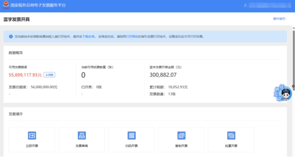 三、藍(lán)字發(fā)票開具頁(yè)面,進(jìn)入后可以看到可用發(fā)票額度,這個(gè)額度就是您企業(yè)可開的數(shù)電票總額度。