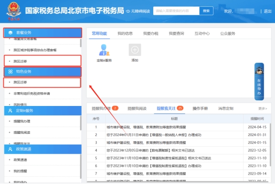 2.提交跨區(qū)遷移申請:請您在電子稅務(wù)局主頁點擊:【套餐業(yè)務(wù)】/【特色業(yè)務(wù)】 — 【跨區(qū)遷移】 — 受理遷移采集表 — 填表,根據(jù)實際情況填寫必填項 — 上傳必傳附件 — 提交等待受理即可。