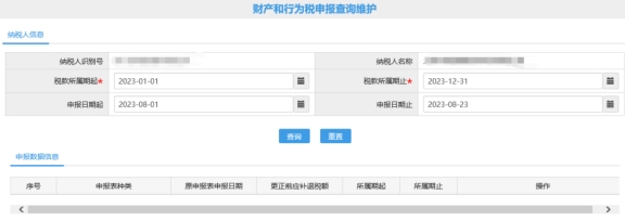 三、點(diǎn)擊后方的“填寫(xiě)申報(bào)表”選擇【財(cái)產(chǎn)和行為稅申報(bào)查詢(xún)維護(hù)】。
