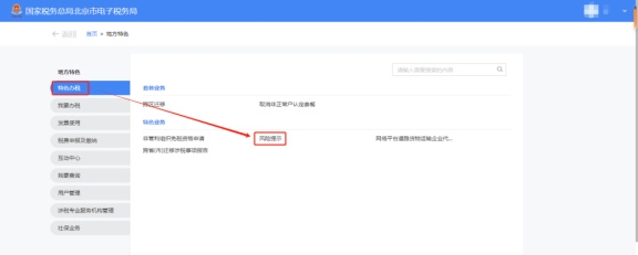 答:納稅人進入新電子稅局后,點擊【地方特色】—打開左側(cè)【特色辦稅】—點擊右側(cè)【特色業(yè)務(wù)】下的【風(fēng)險提示】即可進入原網(wǎng)上風(fēng)控系統(tǒng)風(fēng)險提示界面。