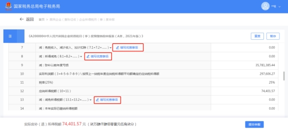 ?、廴艏{稅人存在免稅收入、減計收入、加計扣除、所得減免或減免所得稅額情形,可點擊主表第7、8、13欄的“填寫優(yōu)惠事項”按鈕,彈出對應界面進行勾選和填寫。