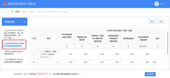 ?、谌艏{稅人需填報其他表單,如《資產(chǎn)加速折舊、攤銷(扣除)優(yōu)惠明細表》,則點擊左側(cè)報表列表進行切換。