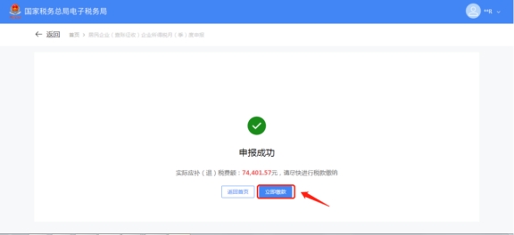 納稅人申報成功后,可以通過點擊“立即繳款”立即進行稅款繳納,完成本次申報涉及的稅費款繳納。