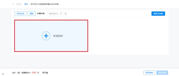 (2)跳轉(zhuǎn)到財(cái)產(chǎn)和行為稅納稅申報(bào)表界面,系統(tǒng)自動(dòng)帶出本期應(yīng)申報(bào)的稅種信息。