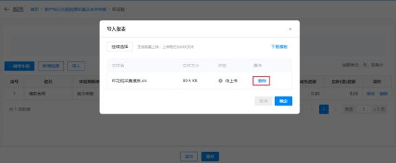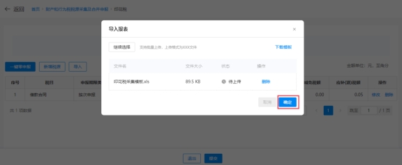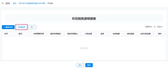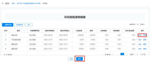 ④上傳成功后,系統(tǒng)在印花稅稅源明細(xì)表界面顯示上傳文件中的稅源信息(若需要改動(dòng)可手動(dòng)修改),確認(rèn)無誤,點(diǎn)擊【提交】。
