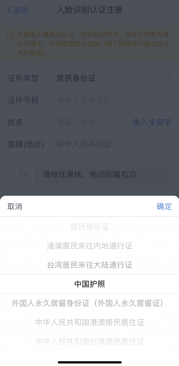 02、在【證件類型】中選擇持有的證件,正確填寫證件號(hào)碼、姓名、國(guó)籍(地區(qū))等注冊(cè)信息后開始人臉識(shí)別。