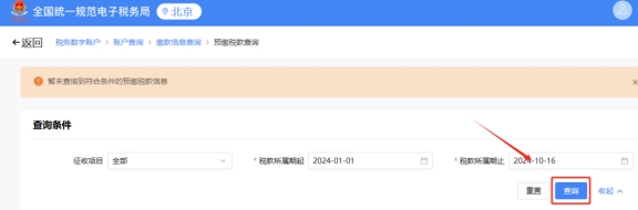 二、預(yù)繳稅款查詢進(jìn)入功能頁(yè)面,輸入查詢條件點(diǎn)擊【查詢】。