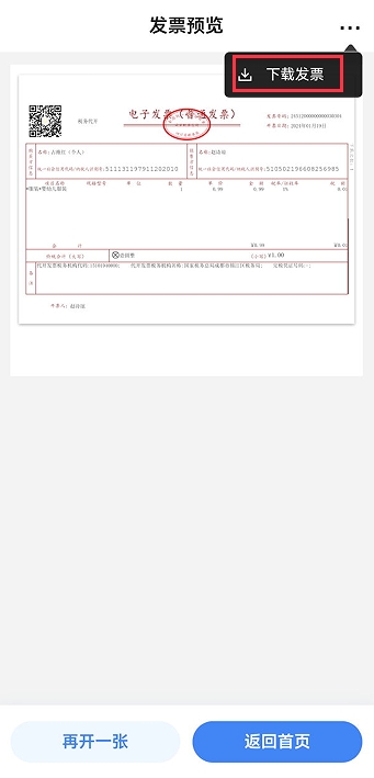 從開具成功界面進(jìn)入發(fā)票下載界面:點(diǎn)擊【確定】,進(jìn)入發(fā)票預(yù)覽頁面,點(diǎn)擊相應(yīng)的按鈕,選擇“下載發(fā)票”進(jìn)行下載。