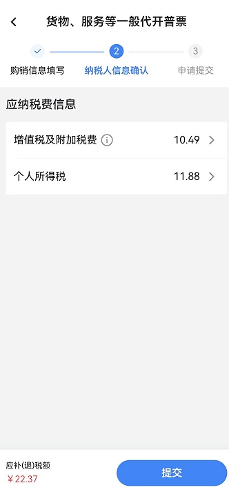 2.7、納稅信息確認(rèn):系統(tǒng)根據(jù)填寫的發(fā)票信息自動(dòng)加載應(yīng)納稅款信息,納稅人確認(rèn)無誤后點(diǎn)擊【提交】。
