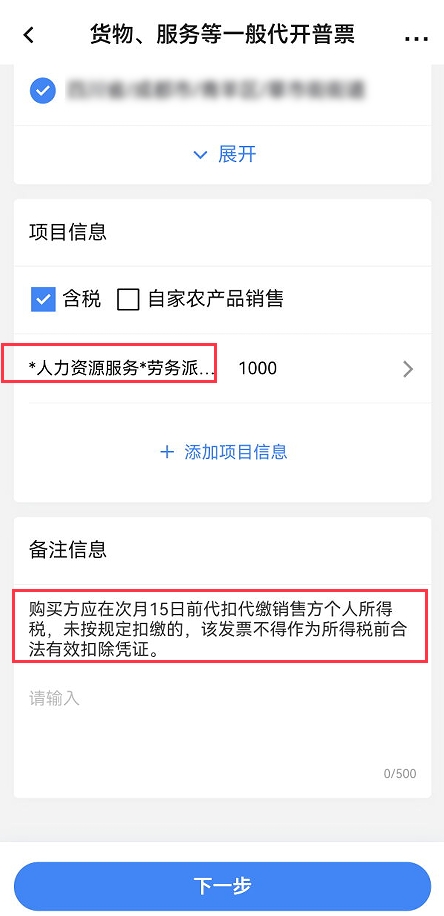 貨物、服務(wù)等一般代開普票時(shí),若個(gè)人所得稅品目為勞務(wù)報(bào)酬、稿酬、特許權(quán)使用費(fèi)所得時(shí),納稅人信息確認(rèn)界面溫馨提示:本次代開申請個(gè)人所得稅項(xiàng)目為勞務(wù)報(bào)酬、稿酬、特許權(quán)使用費(fèi)所得時(shí),由購買方次月15日內(nèi)代扣代繳,如存在異議,請前往稅務(wù)大廳辦理。若為其他個(gè)人所得稅品目不顯示溫馨提示。