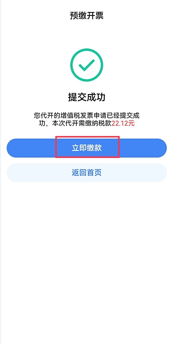 代開申請?zhí)峤怀晒Γ瑹o需審核,需繳款,跳轉(zhuǎn)至預(yù)繳開票頁面,繳款成功后,可自行開具數(shù)電票;