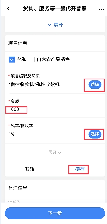 2.5、點(diǎn)擊“添加項(xiàng)目信息”錄入選擇項(xiàng)目編碼及簡稱、錄入金額,選擇稅率,點(diǎn)擊【保存】。