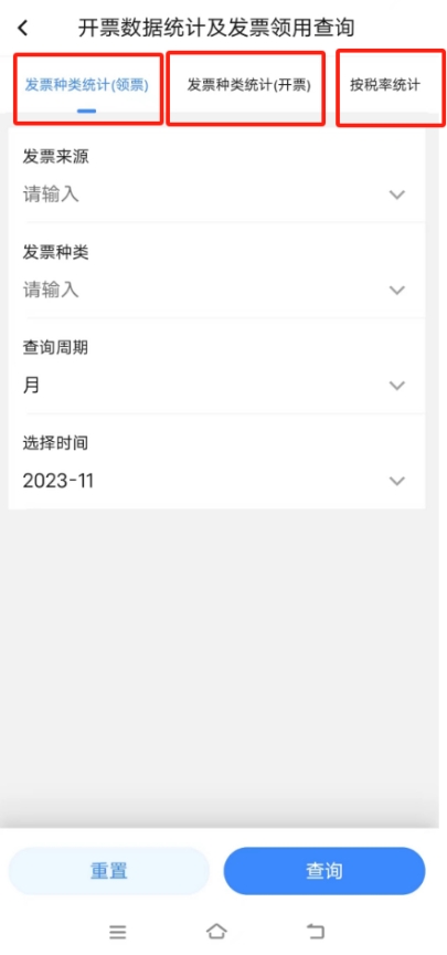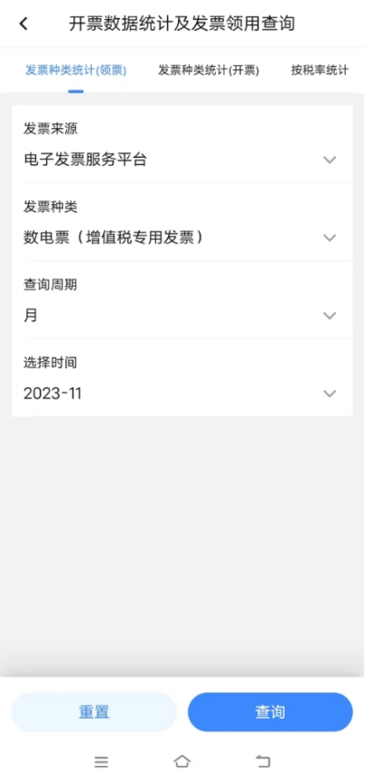 切換至要查詢的界面后,選擇【發(fā)票來源】,【發(fā)票種類】,并設(shè)置【查詢周期】、【選擇時間】查詢條件,點擊【查詢】按鈕。
