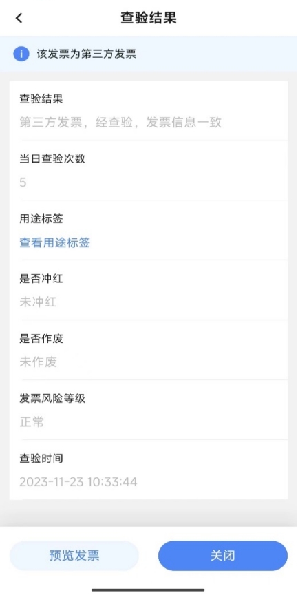 查驗第三方發(fā)票時,查驗結果一致的反饋提示“第三方發(fā)票,經查驗,發(fā)票信息一致”,查驗結果一致時可點擊【預覽發(fā)票】查看發(fā)票票面信息;結果不一致的反饋提示“第三方發(fā)票,經查驗,發(fā)票信息不一致”,查驗結果不一致時不可預覽發(fā)票;若未查到,系統(tǒng)反饋“第三方發(fā)票,未查詢到該發(fā)票信息”。