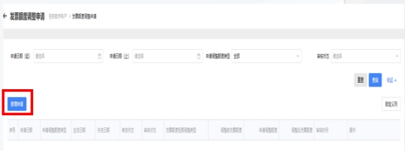 您也可以進(jìn)入【開(kāi)票業(yè)務(wù)】--【藍(lán)字發(fā)票開(kāi)具】界面,點(diǎn)擊“去調(diào)整”,系統(tǒng)將自動(dòng)跳轉(zhuǎn)至發(fā)票額度調(diào)整申請(qǐng)界面。進(jìn)入發(fā)票額度調(diào)整申請(qǐng)界面后,點(diǎn)擊【新增申請(qǐng)】