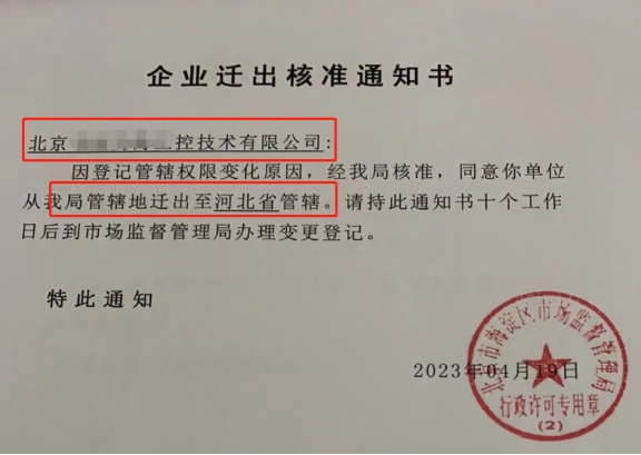 【圖例:北京市海淀區(qū)公司遷移到河北保定】