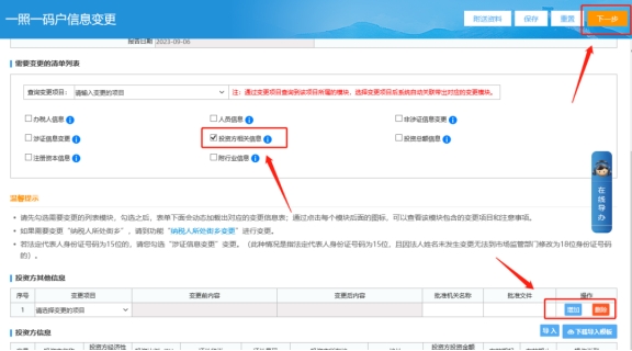 三、一照一碼戶登記信息變更頁面,在此界面勾選“投資方相關(guān)信息”系統(tǒng)會帶出變更項目,請您自行增加或刪除修改,完成后點右上角下一步提交即可。