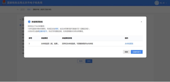①您可選擇辦理未結(jié)事項(xiàng),完成后點(diǎn)擊刷新,如無(wú)未結(jié)事項(xiàng)即可直接打印《清稅證明》; ②您也可以選擇簽署承諾書(shū),先行打印清稅證明,在承諾期限內(nèi)辦結(jié)未結(jié)事項(xiàng)。納稅人采用承諾注銷打印清稅證明后,未辦結(jié)事項(xiàng)可以通過(guò)登錄電子稅務(wù)局進(jìn)入該功能“未辦結(jié)事項(xiàng)告知”辦理。